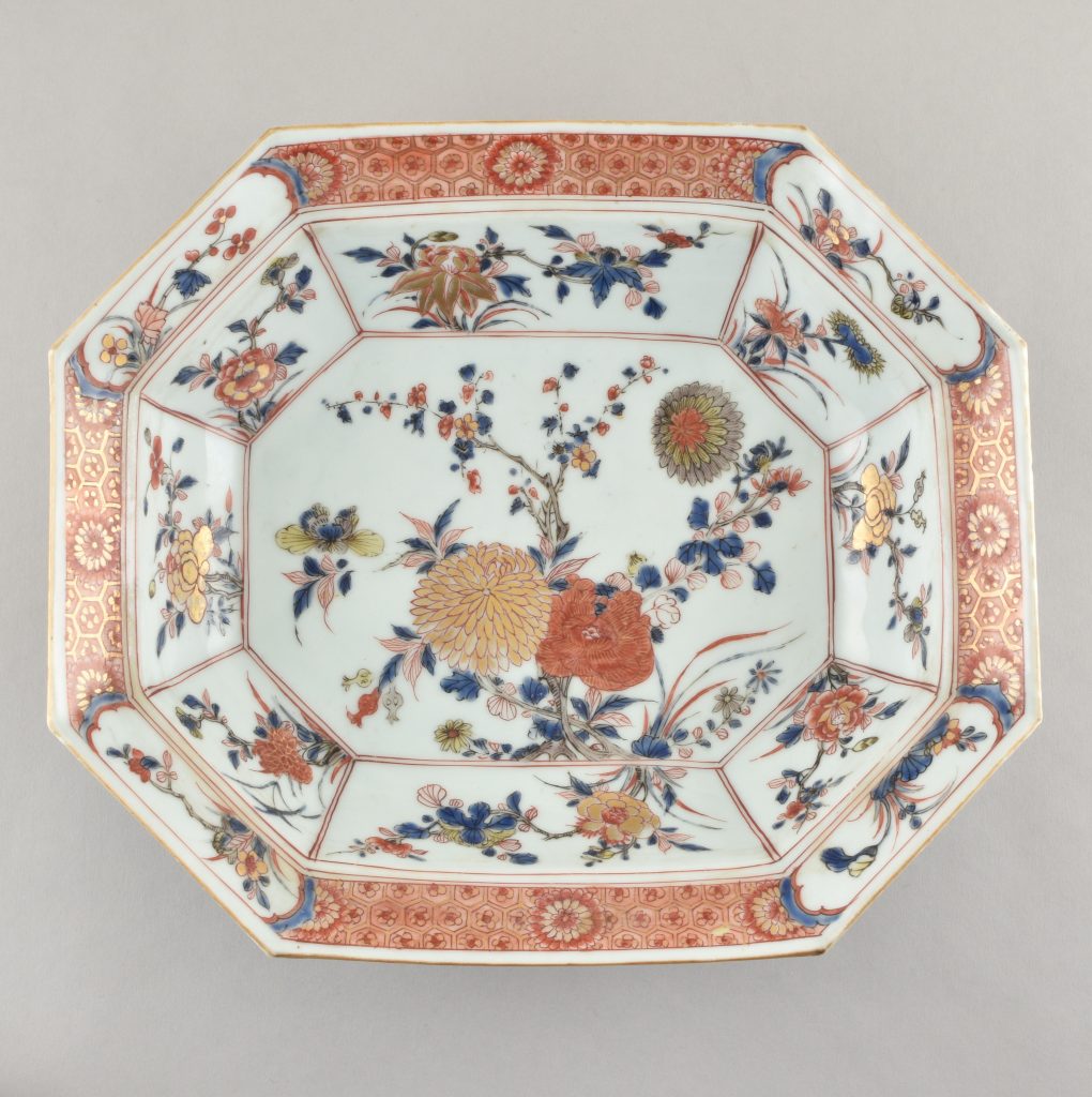 Bassin de forme octogonal décoré en rouge-de-fer et or, et peint d’un décor floral.