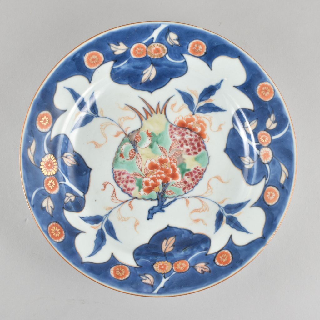 Décorée au centre d’une grenade sur une branche avec des fleurs plus petites et des feuillages. Le fruit, éclaté, révèle ses graines. Le motif central est laissé en réserve sur un fond blanc alors que l’aile est peinte d’un fond bleu, avec des branchages de chrysanthèmes en fleurs, dessinant quatre ruyi.