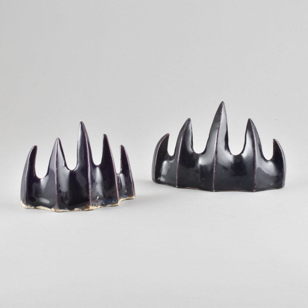 Deux repose-pinceaux à décor monochrome aubergine, représentant la montagne sacrée à cinq pointes (Mont Meru).