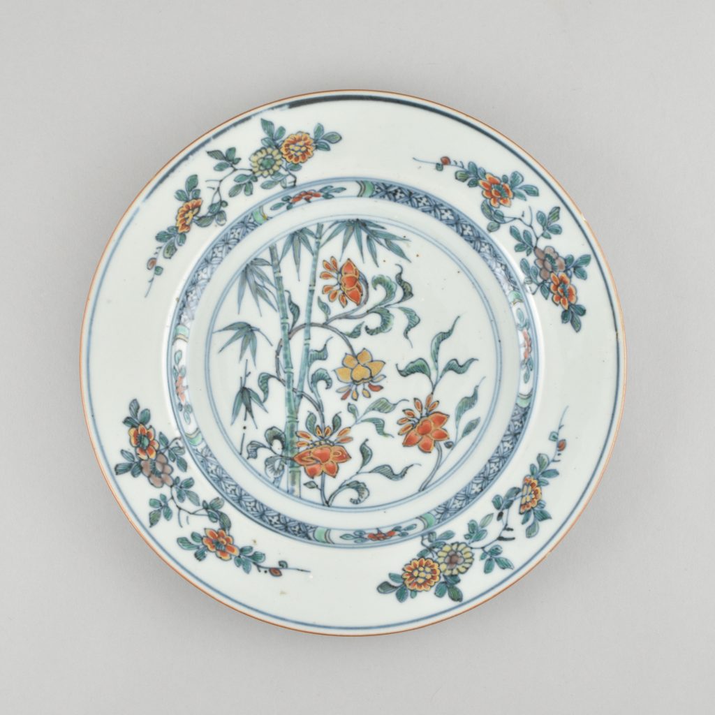 Décorées en émaux doucai de fleurs de lotus et bambous au centre, l’aile ornée de branches de chrysanthèmes et pivoines fleuries.