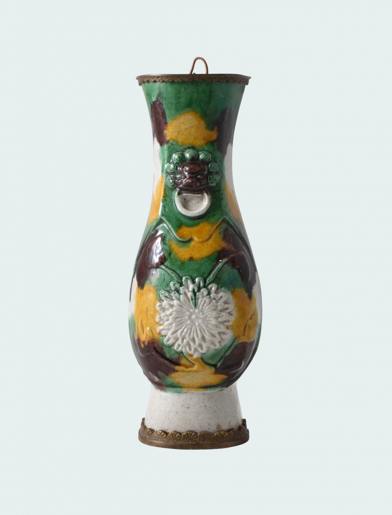 Vase mural (ou d’applique) creux, de forme balustre avec un corps arrondi, sur une large plinthe, un dos plat et un petit trou en haut pour fixer un accrochage. Il est décoré d’une fleur de chrysanthème appliquée au centre, et d’un masque de monstre appliqué au cou. Le devant est peint avec des émaux jaunes, […]