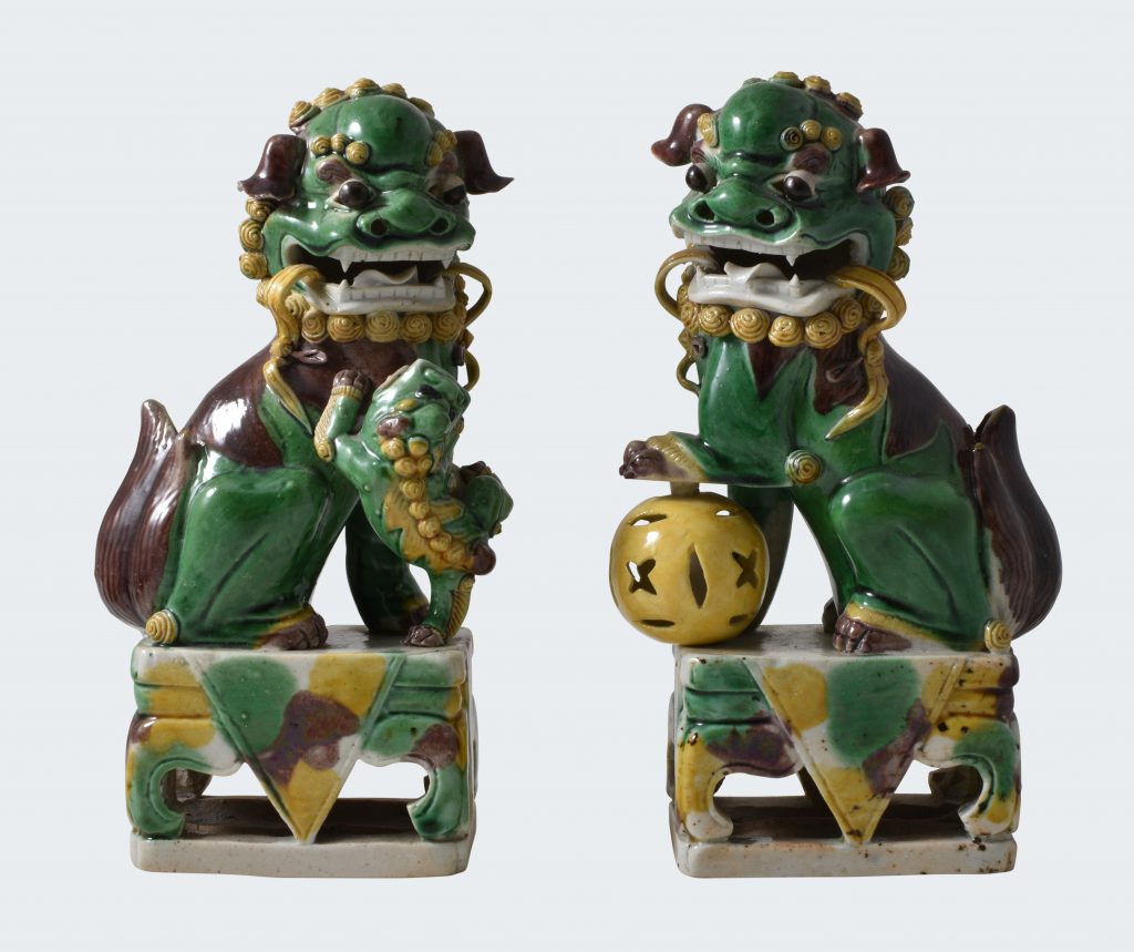 Paire de chiens de fô peints dans les émaux de la famille verte sur le biscuit d’époque Kangxi