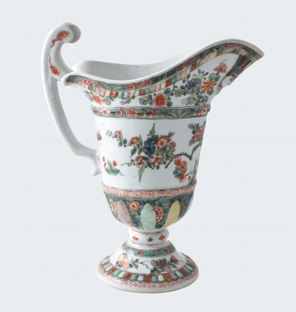 Grande « aiguière à crosse » peinte dans les émaux de la famille verte en porcelaine de Chine d’époque Kangxi