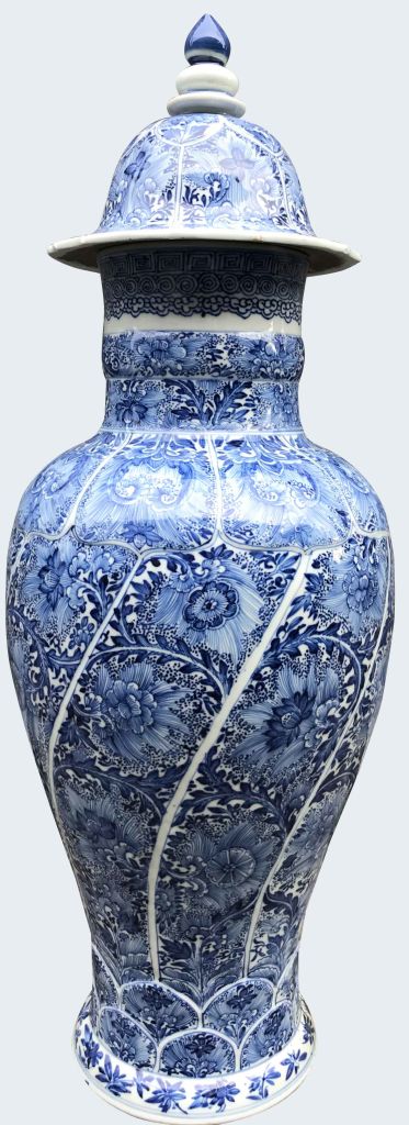 Peinte dans les émaux de la famille verte avec au centre un médaillon central avec une paire de canards dans un jardin de grenades et de pivoines, entourés de cartouches avec qilin, un phénix, et paysage de rivière et des vases à fleurs, alternent avec des panneaux de jardins fleuris, la base est marquée de […]