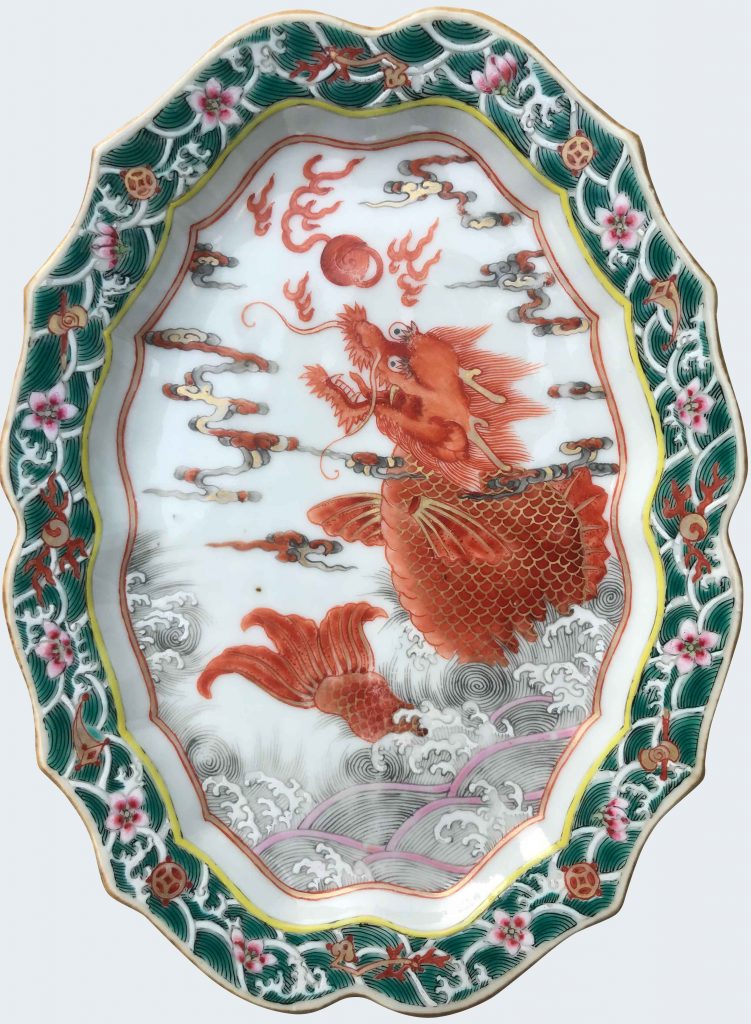 Rare plateau de terrine décoré dans les émaux de la famille rose représentant d’un dragon se transformant en poisson en porcelaine de Chine d’époque Qianlong