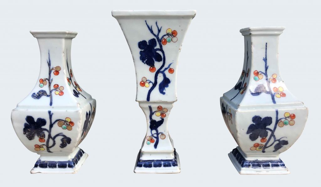 Une garniture de trois vases de ‘Pronk’ à décor “foxgrape” en porcelaine de Chine d’époque Qianlong