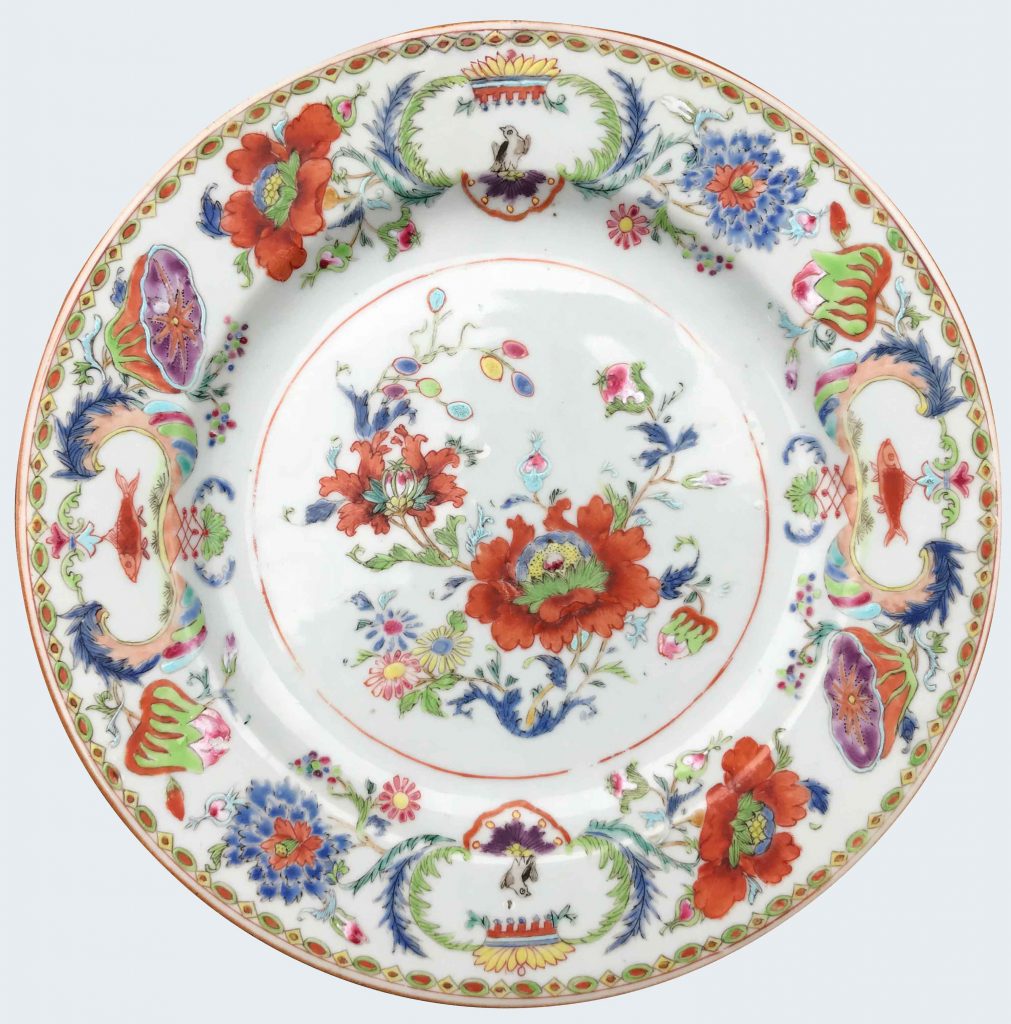 Peinte dans les émaux de la famille rose, en polychromie à « dominante bleu », l’intérieur à décor caractéristique de pivoines dans un médaillon central et quatre cartouches alternés aux armes d’un aigle et d’un poisson autour du cavetto.