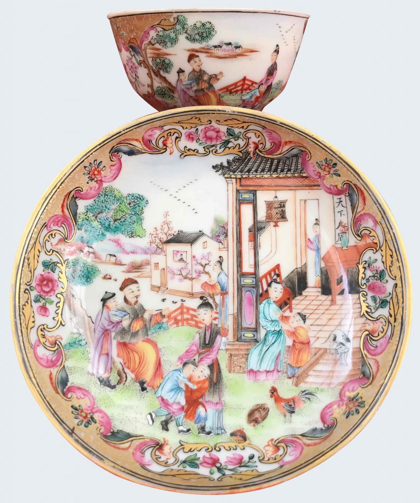 Bol à thé et sa soucoupe à décor de mandarins en porcelaine de Chine d’époque Qianlong