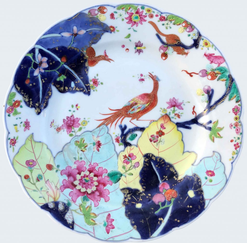 Décorées en bleu sous glaçure, émaux polychromes, et or, avec une paire de faisans parmi des feuilles et fleurs. Deux écureuils courent sur des branches de vigne.