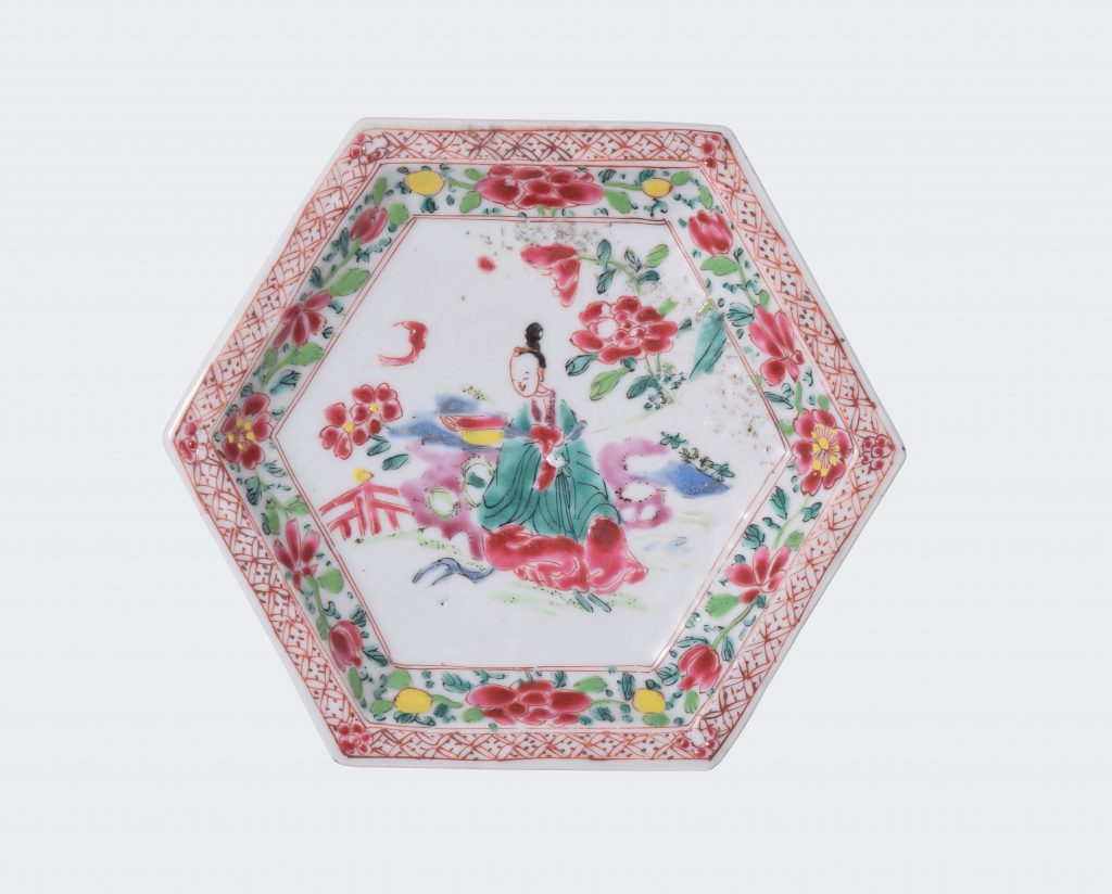 De forme octogonale, à décor d’une élégante parmi des pivoines.