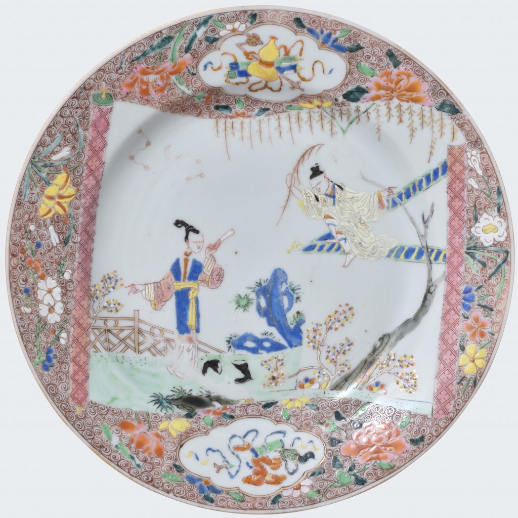 Assiette peinte dans les émaux de la famille rose représentant un épisode du Xi Xiang Ji en porcelaine de Chine d’époque Yongzheng