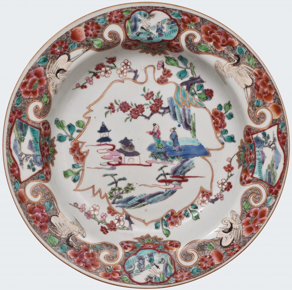 Peinte dans les émaux de la famille rose, à décor d’un paysage avec deux personnages dans une feuille d’hibiscus. Sur l’aile, des grues en vol et des cartouches figurés.