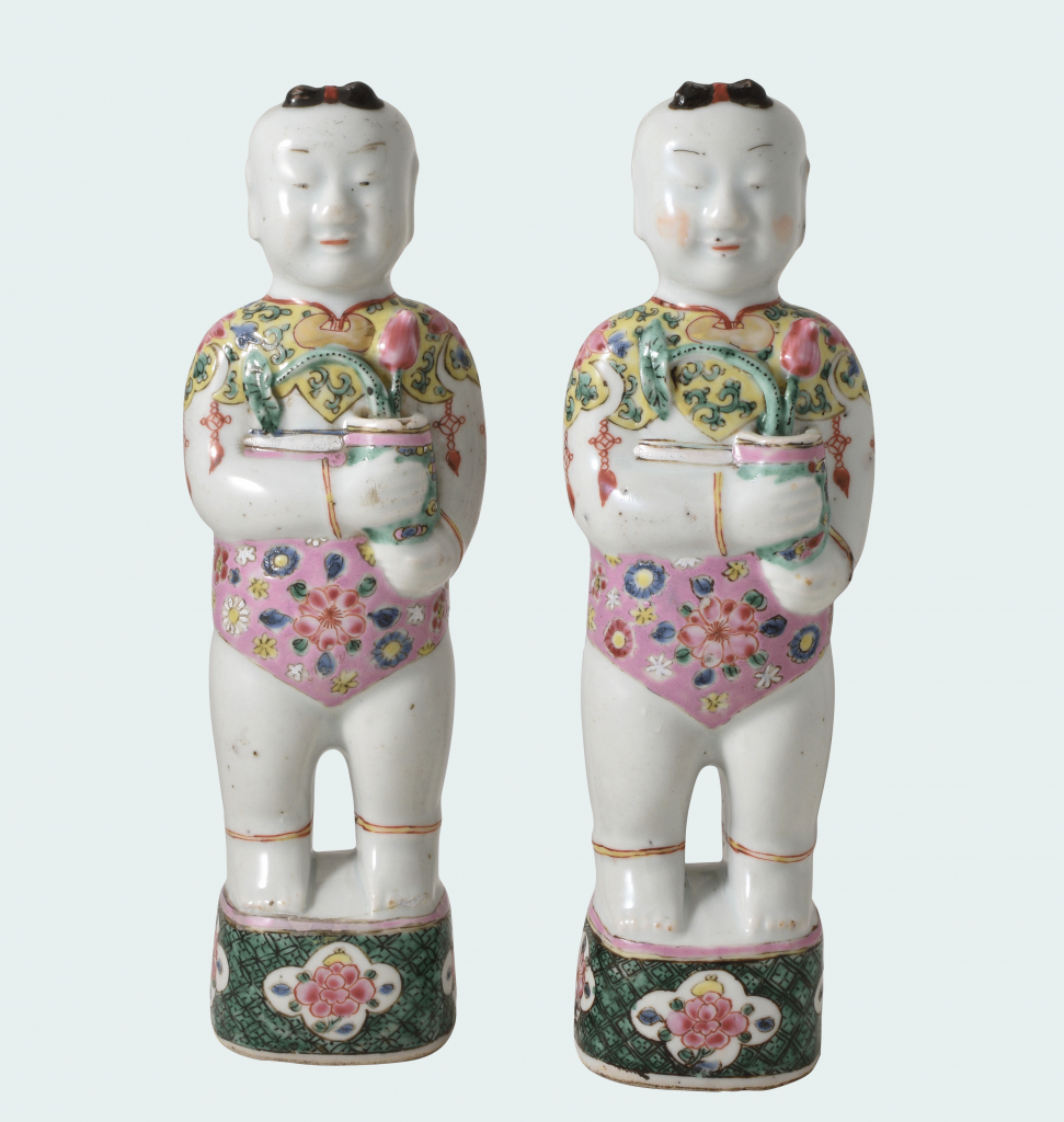 Peints dans les émaux de la famille rose, sur une plinthe décorée dans des émaux noirs et de la famille rose.