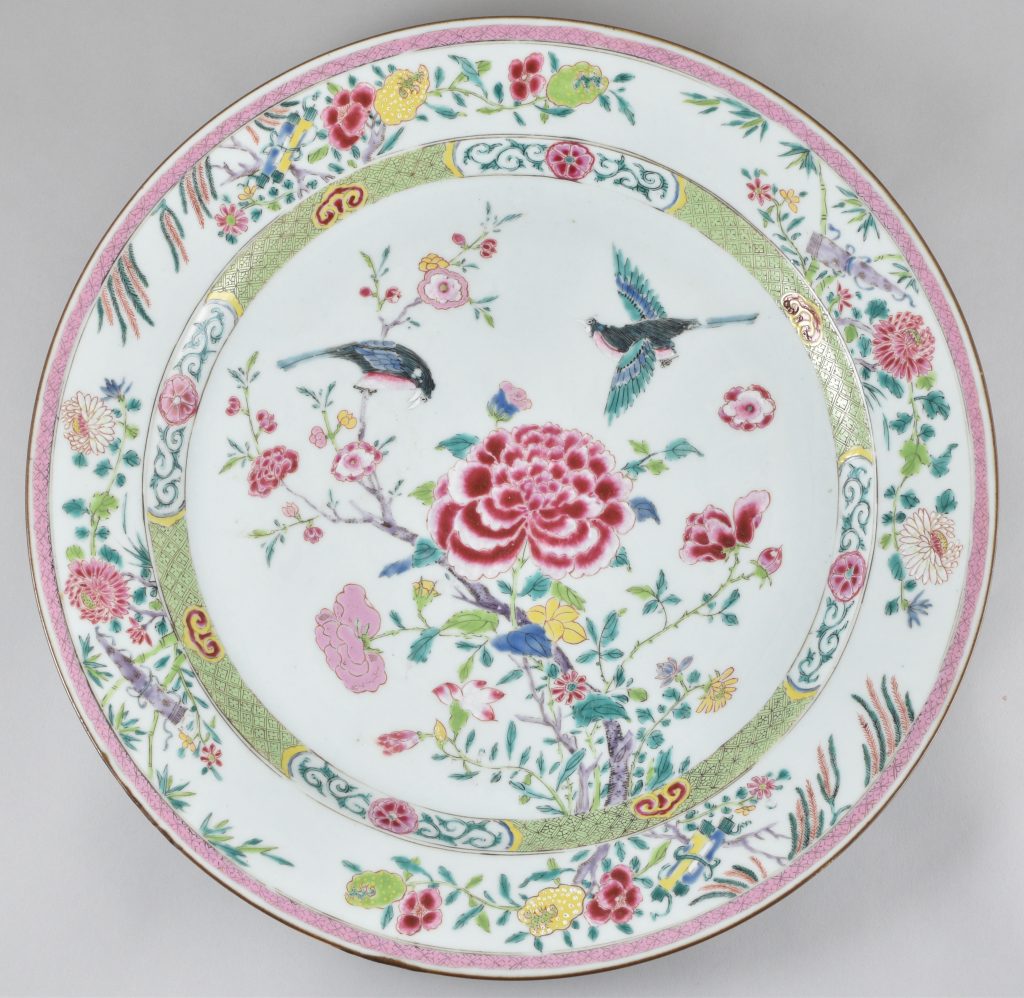 Très grand plat peint dans les émaux de la famille rose à décor d’oiseaux en porcelaine de Chine d’époque Yongzheng