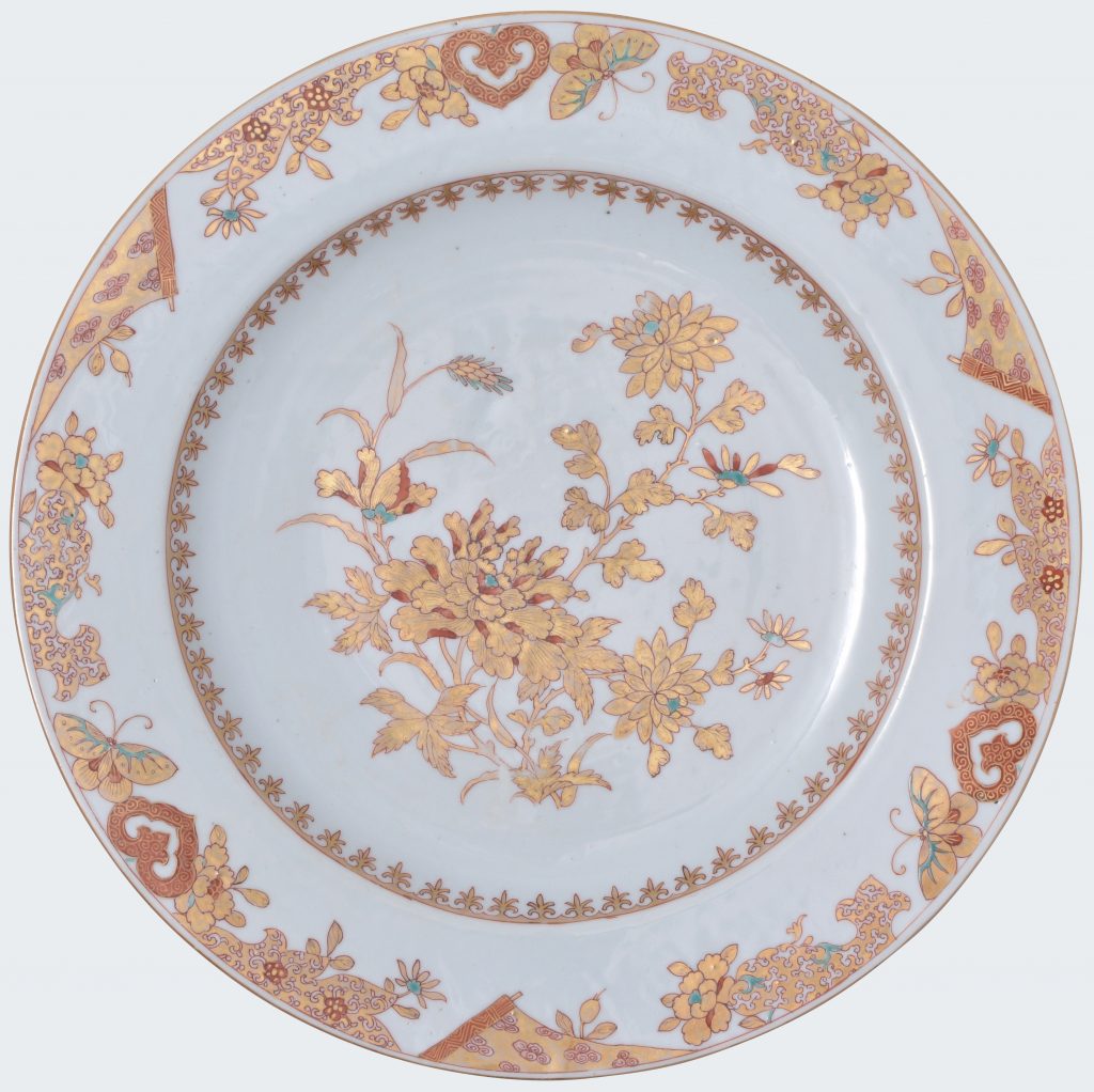 Grand plat à décor en or en porcelaine de Chine d’époque Yongzheng