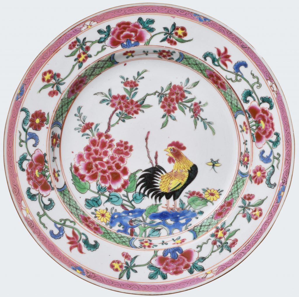 Émaillé de couleurs vives dans la palette de la famille rose, au centre avec un coq perché sur un rocher percé à côté de pivoines -et de papillons dans un cartouche en reserve sur un fond noir.