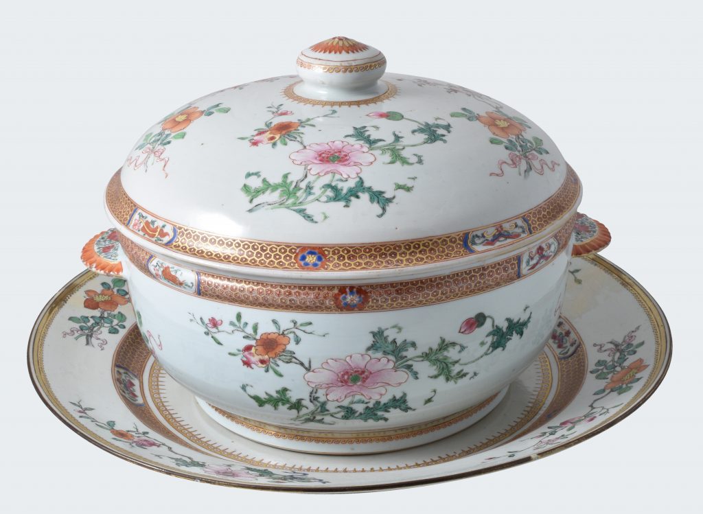 Large pot-à-oille et son présentoir à décor floral en porcelaine de Chine d’époque Yongzheng