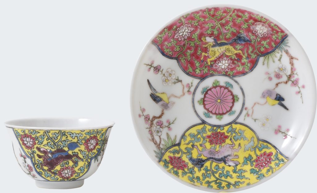 Décoré dans les émaux opaques de la palette de la famille rose, avec quatre cartouches, deux avec un oiseau perché sur une branche d’arbre, les deux autres panneaux avec un feuillage et des fleurs denses et une bête mythique (qilin), sur un fond peint en reserve rouge et jaune.