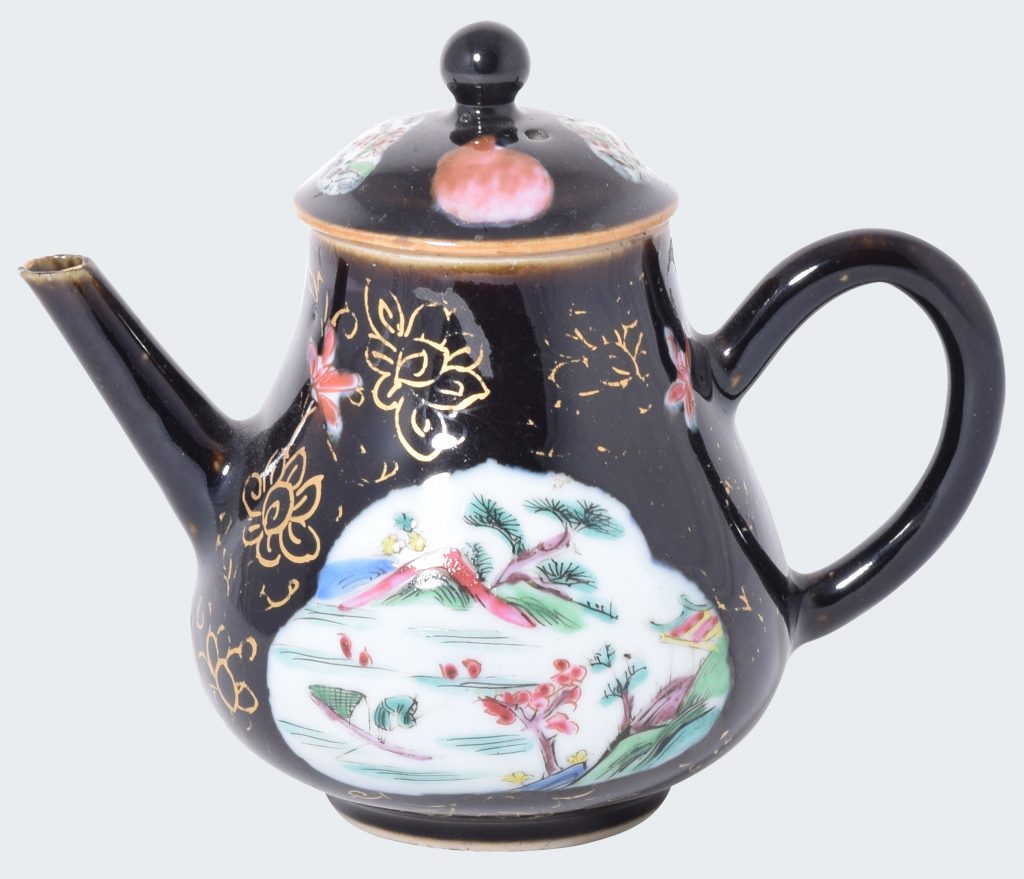 Théière peinte dans les émaux de la famille rose sur un fond coloré noir en porcelaine de Chine d’époque Yongzheng.