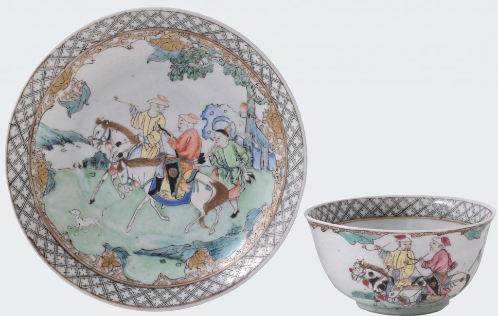 D’une taille inhabituelle, décoré dans la palette de la famille rose, avec deux chasseurs vêtus de chapeaux jaunes, l’un avec un manteau jaune et l’autre avec un manteau rose. La servante porte un manteau vert pâle et une culotte rose. La bordure est en couche noire avec un ornement floral en or.