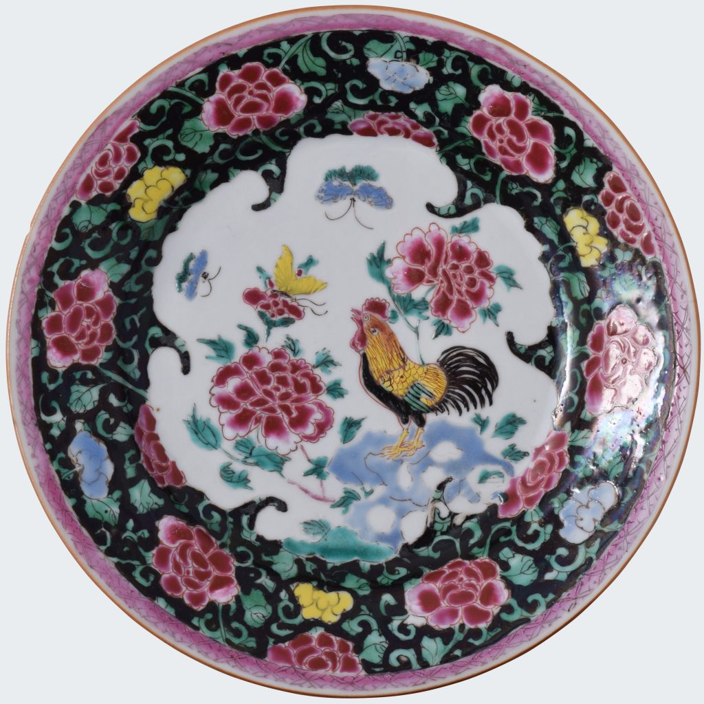 Émaillée de couleurs vives dans la palette de la famille rose, au centre avec un coq perché sur un rocher percé à côté de pivoines -et de papillons dans un cartouche en reserve sur un fond noir.