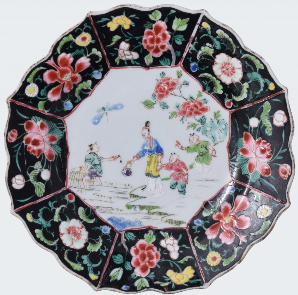 Peinte dans les émaux de la famille rose, de forme polylobée, avec au centre une jeune femme tenant un enfant par la main et un pêcheur sur la gauche. Sur l’aile, huit compartiments avec des fleurs sur un fond brillant noir.