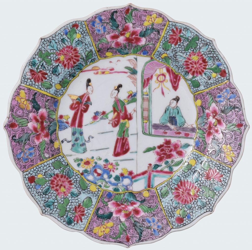 Peintes dans les émaux de la famille rose, de forme polylobée, avec au centre de jeunes élégantes chinoise dans un jardin. Sur l’aile, huit compartiments avec des fleurs brillamment émaillées.